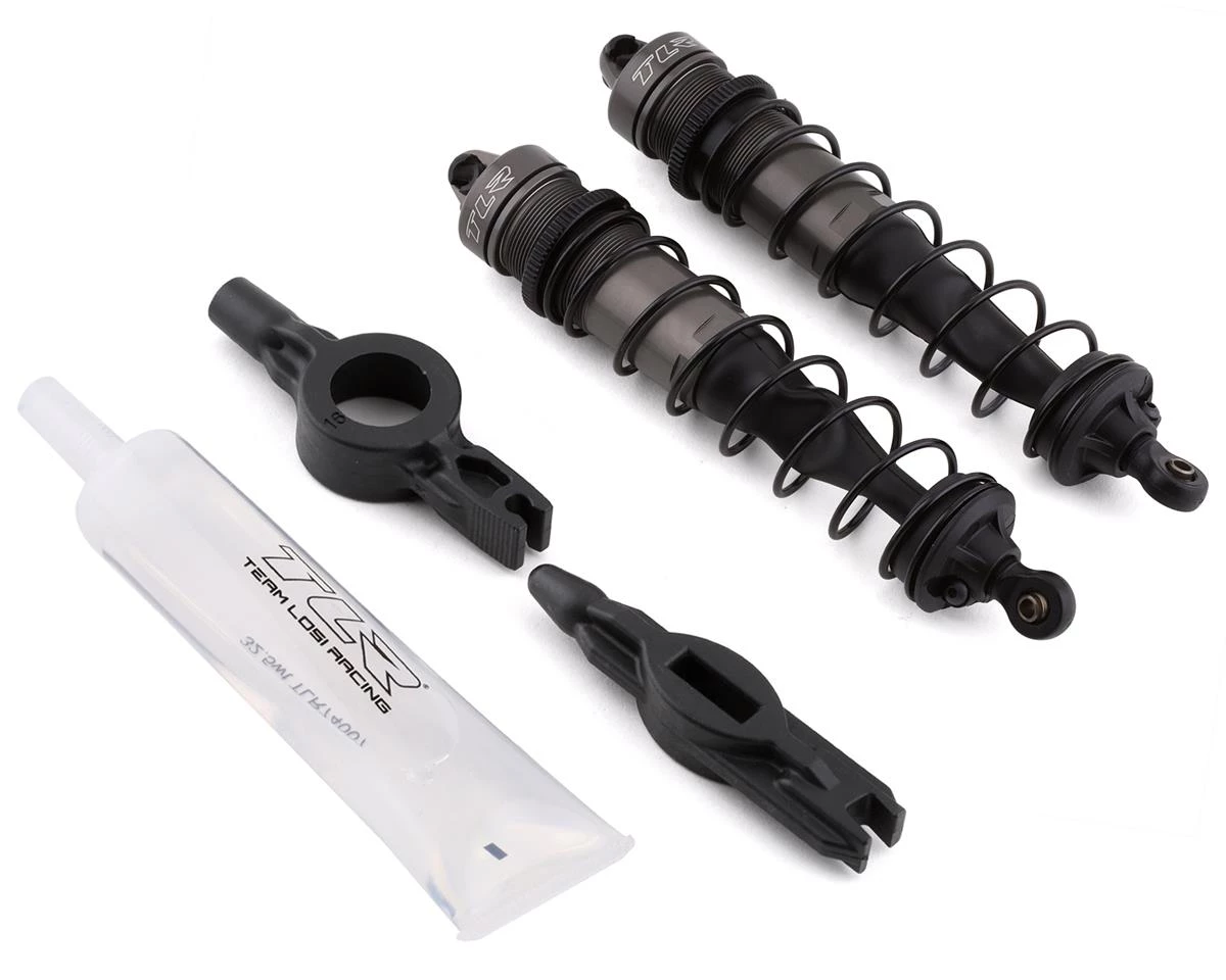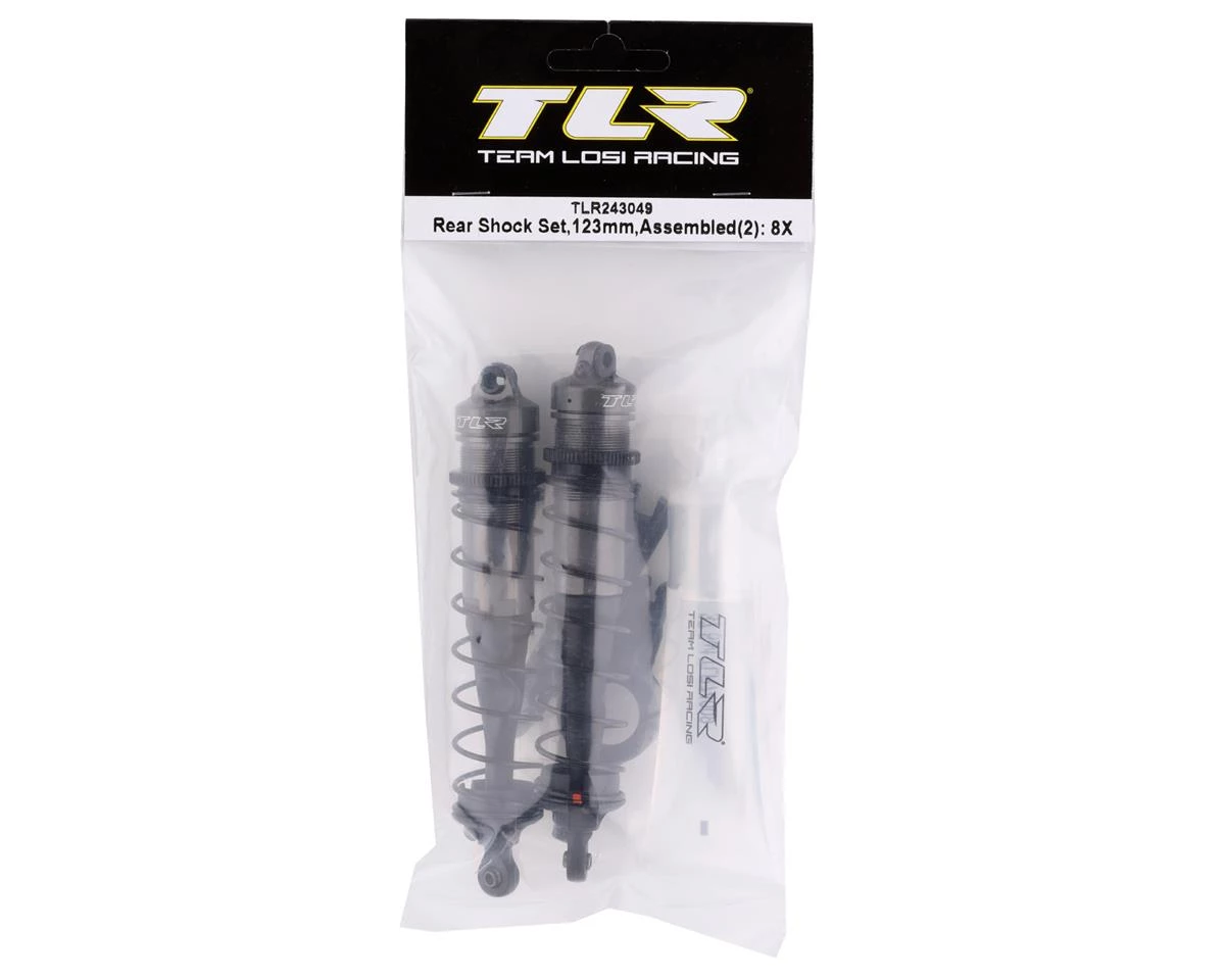 Team Losi Racing 123mm Assembled Rear Shock Set with 37.5wt Shock Oil. This optional set of rear shocks come preassembled and only require to be filled with the included oil. Featuring shock boots, red shock springs, bleeder style shock caps and aluminum shock collars to provide an almost race ready setup. Package includes two assembled rear shocks, one tube of shock oil and two plastic shock tools intended for the Team Losi Racing 8IGHT-X, 8IGHT-X Elite, 8IGHT-XE and 8IGHTXT/XTE.