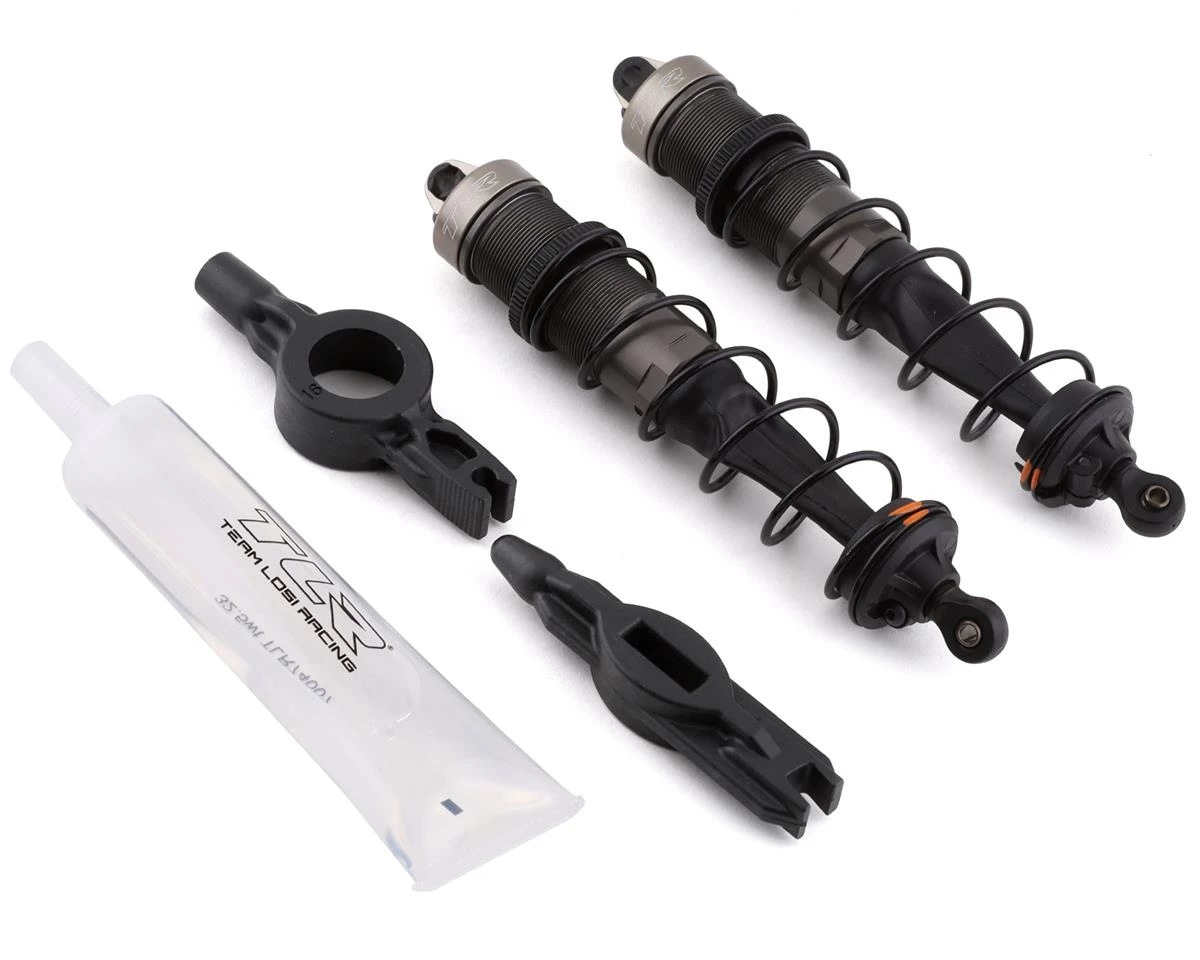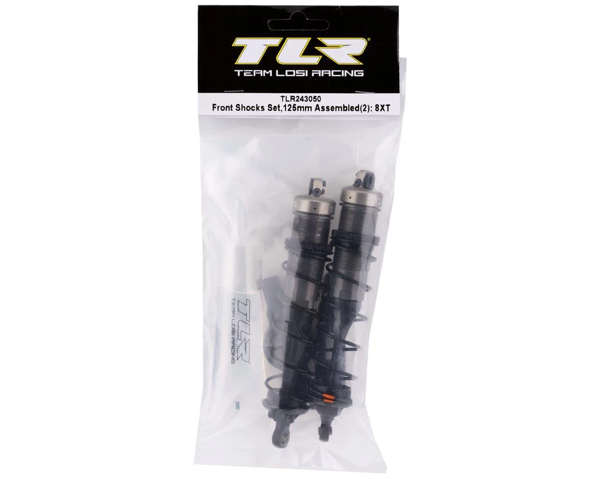 Team Losi Racing 125mm Assembled Front Shock Set with 37.5wt Shock Oil. This optional set of front shocks come preassembled and only require to be filled with the included oil. Featuring shock boots, orange shock springs, bleeder style shock caps and aluminum shock collars to provide an almost race ready setup. Package includes two assembled front shocks, one tube of shock oil and two plastic shock tools intended for the Team Losi Racing 8IGHT XT/XTE.