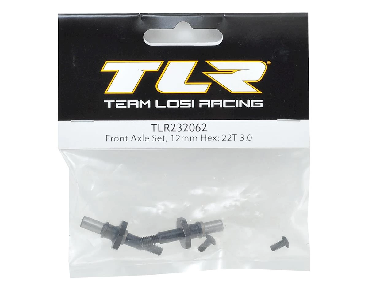 This is a replacement Team Losi Racing 12mm Hex Front Axle Set, compatible with the 22T 3.0 and 22SCT 3.0 trucks.
