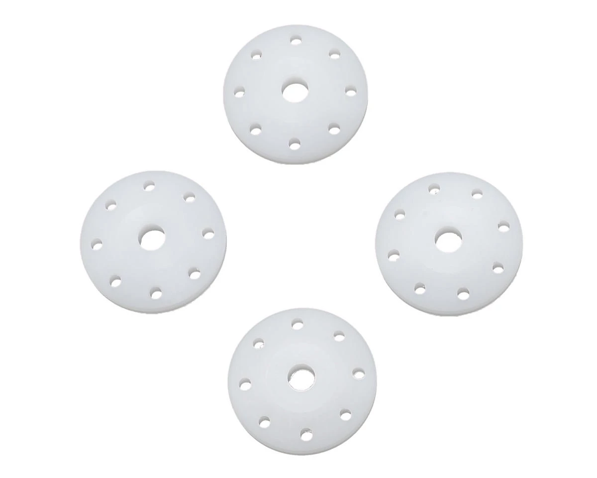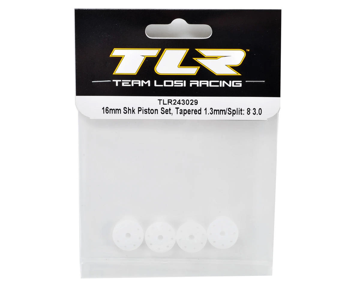 This is an optional Team Losi Racing 16mm Tapered Shock Piston Set. This package includes two 1.3 x 8 hole pistons, and two “split” pistons that have four 1.3 holes and four 1.2 holes.