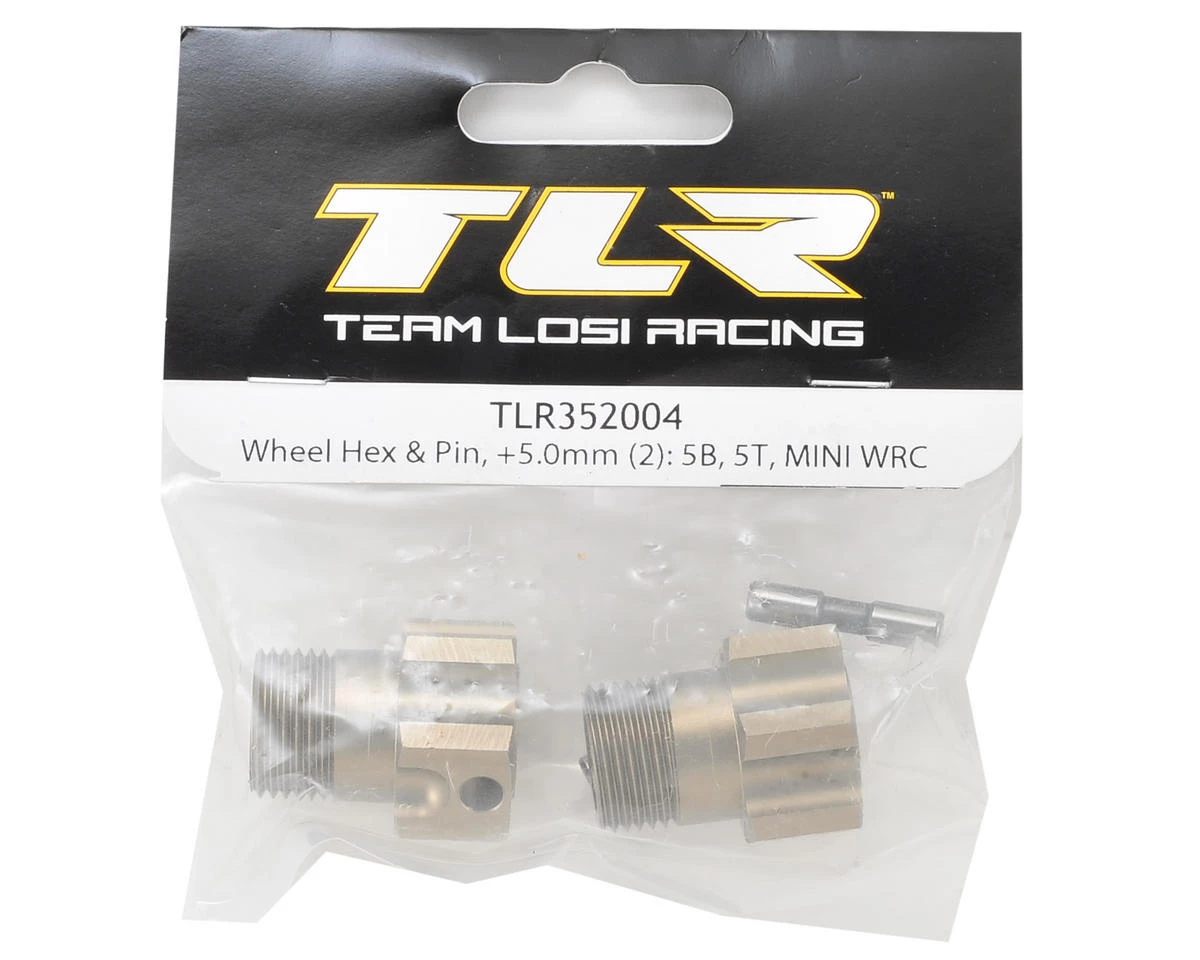 This is a pack of two optional Team Losi Racing Wheel Hexes with axle pins. These hexes provide 5mm additional width on each side. Compatible with the 5IVE-B, 5IVE-T and 5IVE Mini WRC.