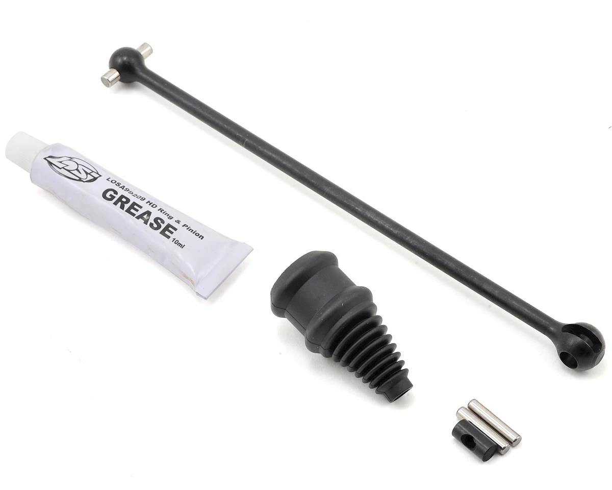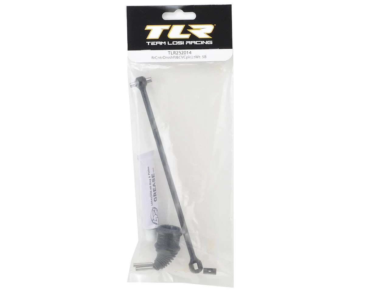 TLR 5IVE-B Lightweight Rear Center Driveshaft & CV Coupler. This is the replacement rear center driveshaft. Package includes driveshaft, driveshaft boot, grease, coupler barrel and two coupler pins.