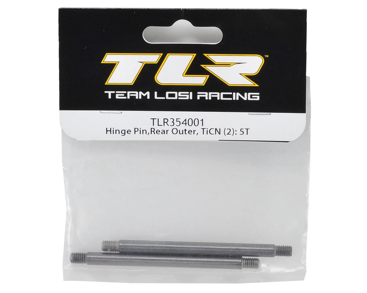 This is a pack of two optional Team Losi Racing 5IVE-T TiCN Rear Outer Hinge Pins. The Ti-Carbonitride coating has proven to be a very smooth and even more reliable than Ti-Nitride, and will provide smooth, friction-free operation.