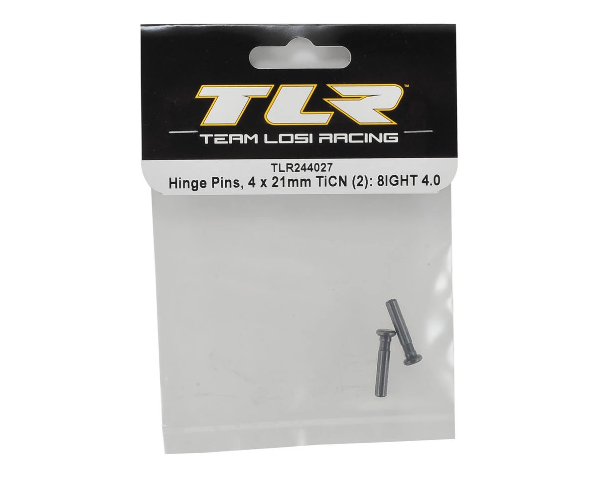Team Losi Racing 8IGHT 4.0 4 x 21mm TiCN Hinge Pins. These are the standard replacement TiCN pins. The TiCN (Ti-Carbonitride) coating has proven to be a very smooth and even more reliable than Ti-Nitride. These are the king pins used to connect the spindles to the spindle carriers.