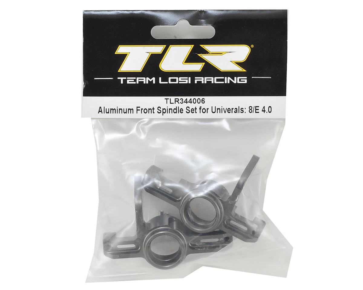 The Team Losi Racing 8IGHT 4.0 Aluminum Front Universal Spindle Set is included with the 8IGHT 4.0 Tuning Kit (TLR248000), and is compatible with the 8IGHT-E 4.0 as well. Package includes two spindles and hardware.