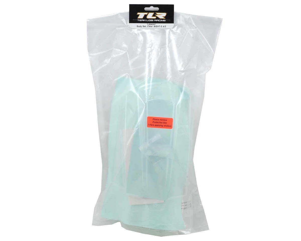 The Team Losi Racing 8IGHT-E 4.0 Cab Forward Clear Body is factory trimmed. Package includes body, window mask and decal sheet.
