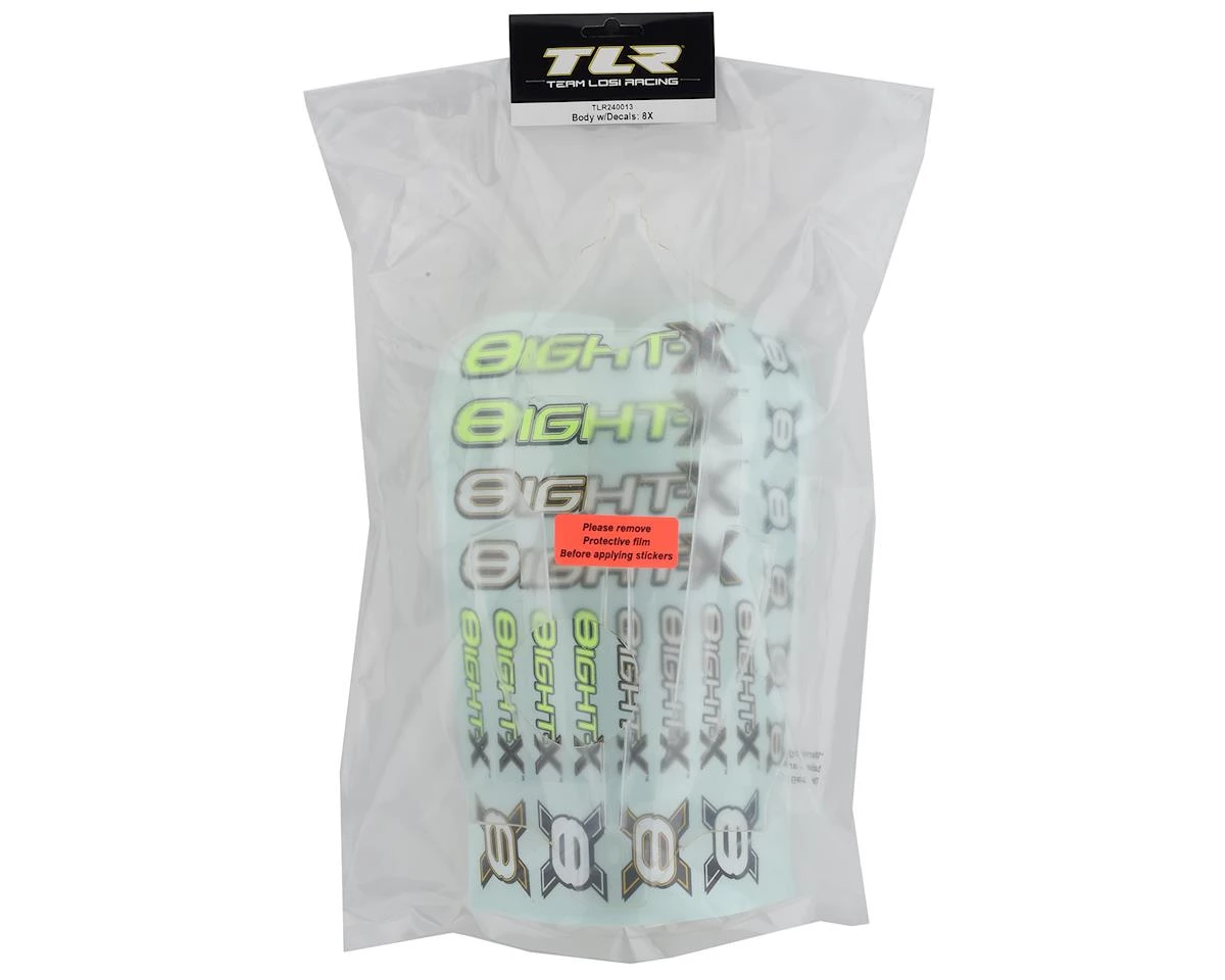 This is a replacement Team Losi Racing 1/8 Nitro Buggy Body in Clear Lexan material, for use with the 8IGHT-X. This body requires polycarbonate specific paint, but it pre-trimmed. Package includes window masks.