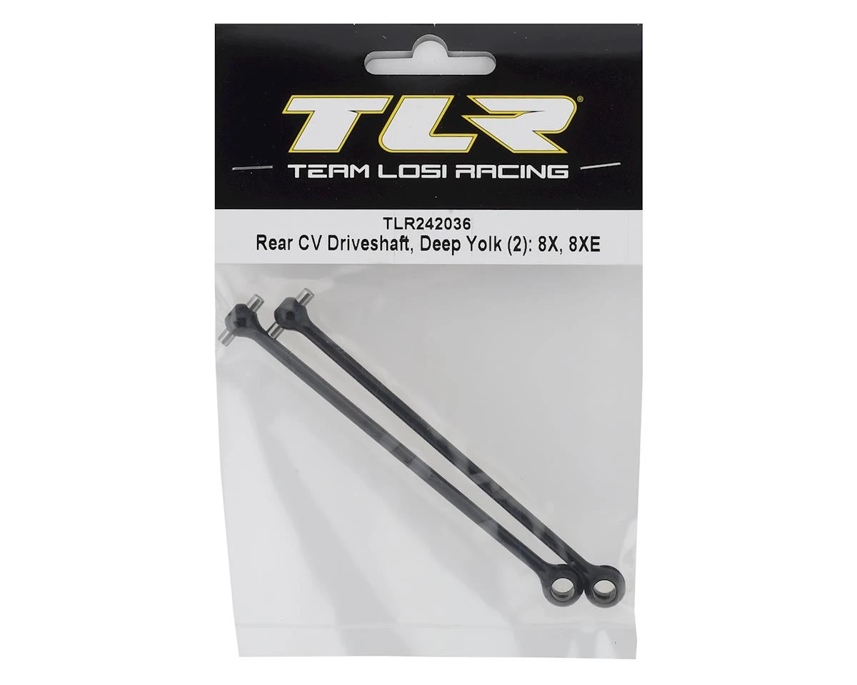 This is a replacement set of two Team Losi Racing Deep Yolk Rear CV Driveshafts, intended for use with the TLR 8IGHT-X Elite 1/8 buggy.