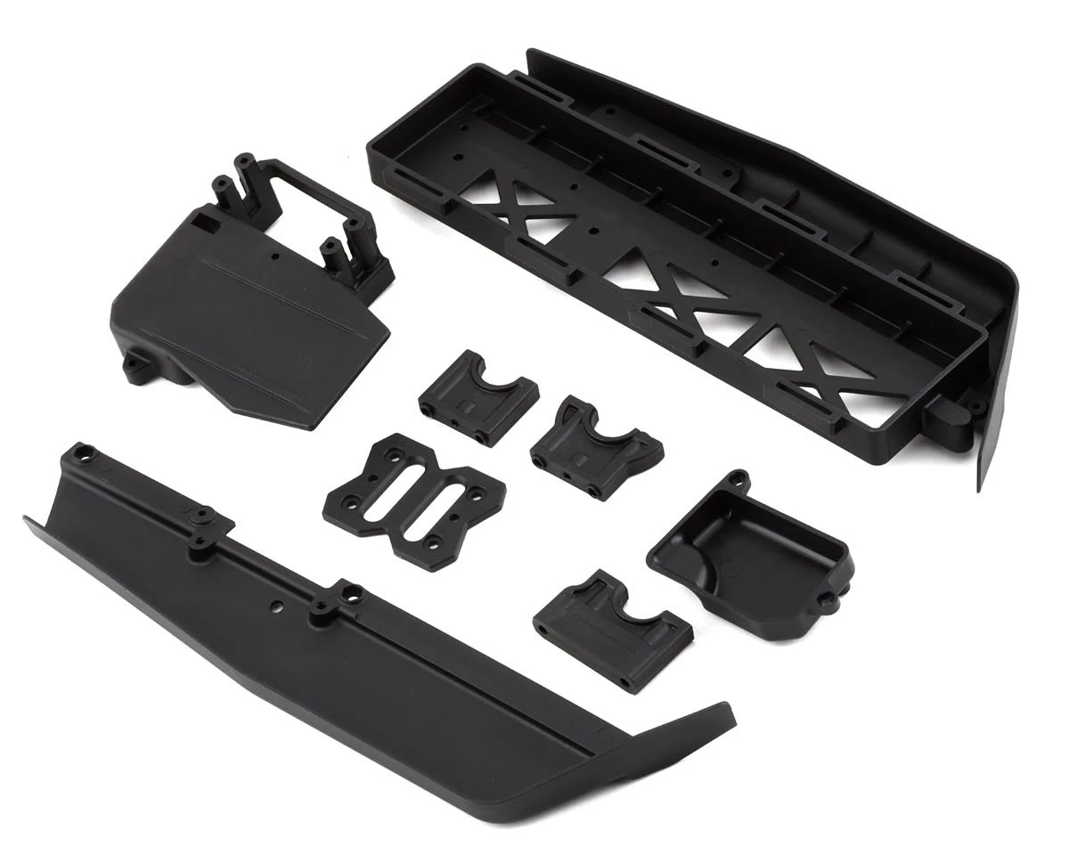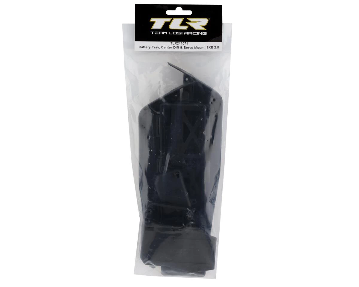 Team Losi Racing 8IGHT-X/E 2.0 Battery Tray with Center Differential and Servo Mount. This replacement parts set is intended for the 8IGHT-X/E 2.0 when using the Electric setup. Package includes one battery tray, one side plate and one center differential mount.