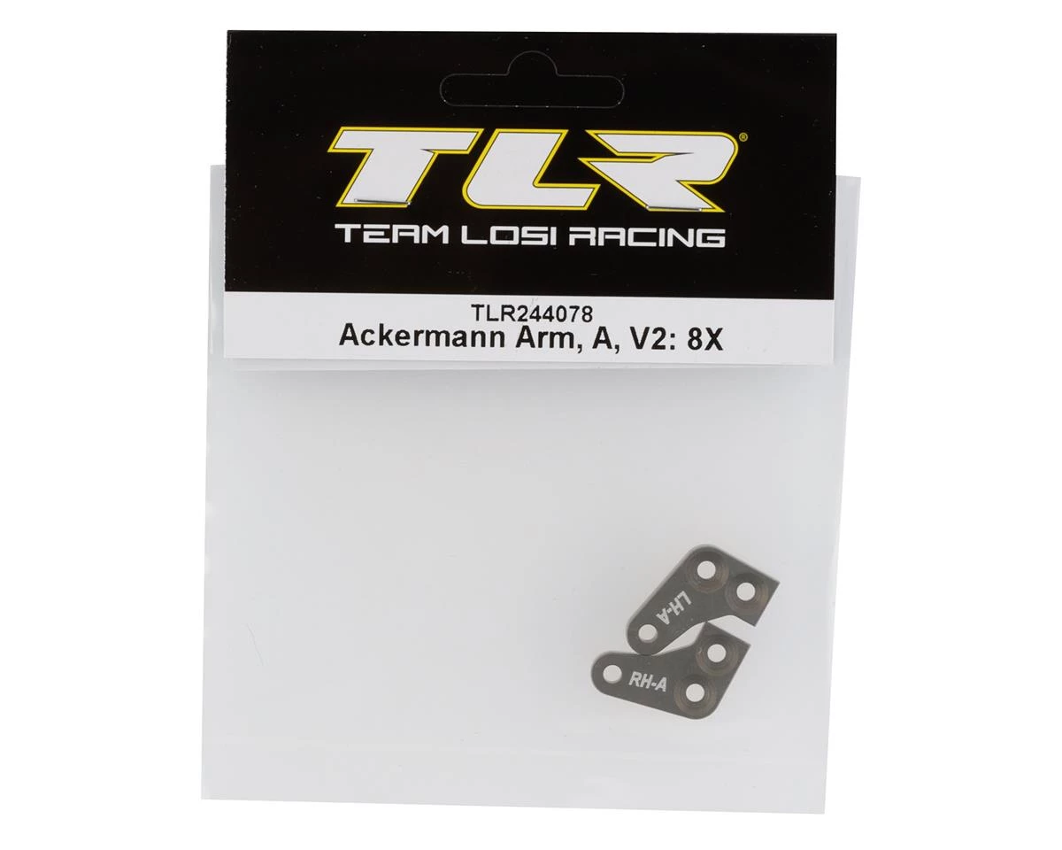 Team Losi Racing 8IGHT-X/E V2 Ackermann Arm “A”. This is a replacement Ackermann arm intended for the 8IGHT-X/E 2.0. Package includes two type “A” aluminum Ackermann arms.