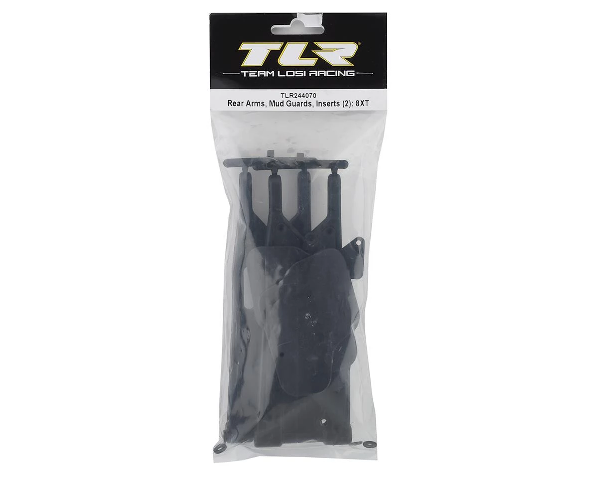 This is a replacement set of two Team Losi Racing 8XT Rear Arms, Mud Guards and Inserts, intended for use with the 8IGHT-XT/XTE 1/8 Nitro/Electric 4WD Off-Road Truggy Kit.
