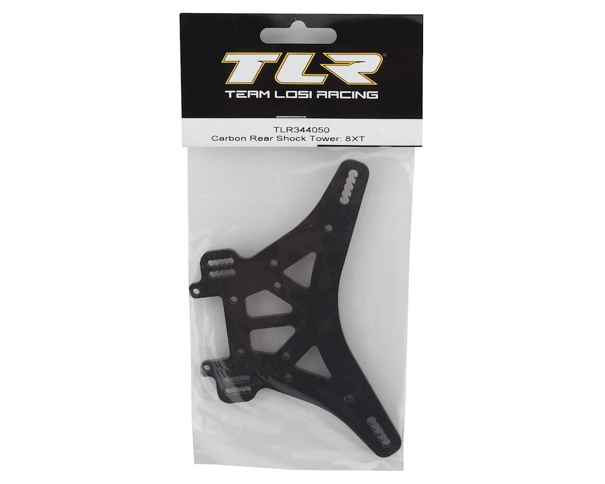This is a Team Losi Racing 8XT Carbon Rear Shock Tower, cut from quality carbon plate and intended for use with 1/8 8IGHT-XT/XTE 1/8 4WD Off-Road Truggy Kits.