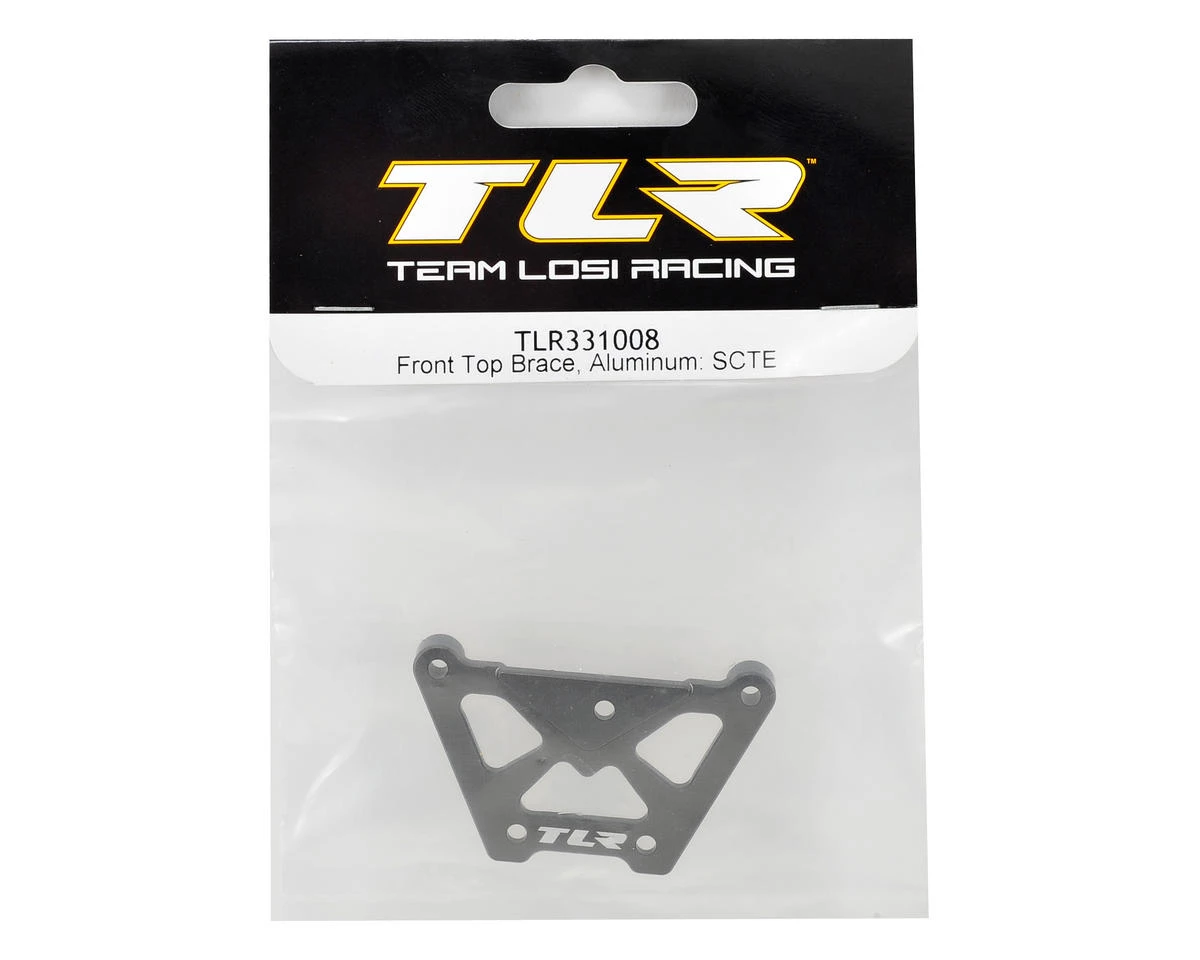 This is an optional Team Losi Racing SCTE Aluminum Front Top Brace. This top brace replaces the stock plastic brace for improved strength and rigidity.