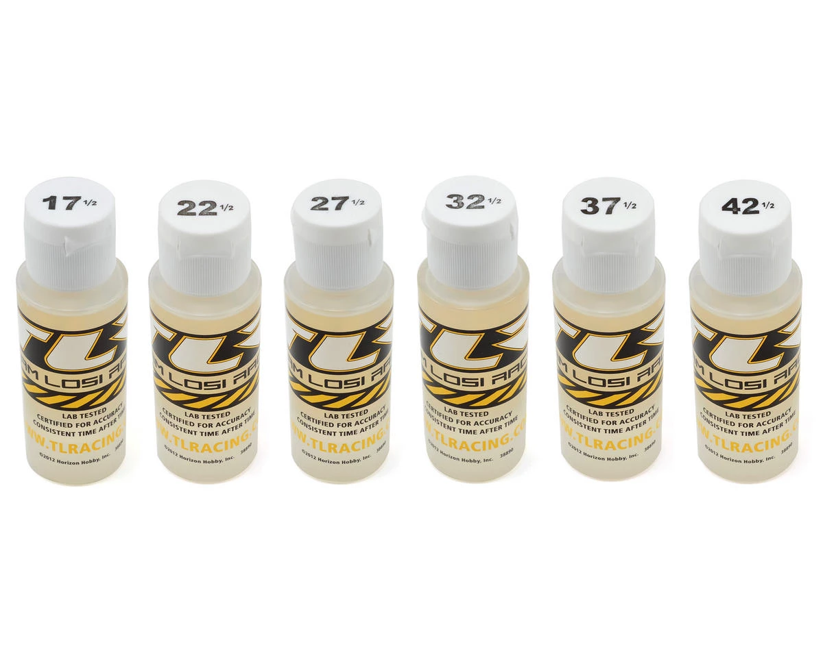 This is a six pack of 2oz bottles of Team Losi Racing silicone shock oil used with oil filled shocks. This six pack includes the half oil weights in the Losi shock oil family, and includes a bottle each of 17.5wt, 22.5wt, 27.5wt, 32.5wt, 37.5wt and 42.5wt oils. Losi shock oil is made from 100% pure silicone oil and will not thin out in hot weather or thicken up in cold weather. The higher the weight number of the oil, the thicker the oil is. Losi shock oil is generally slightly thicker than Team Associated shock oil with the same ‘weight’ rating.