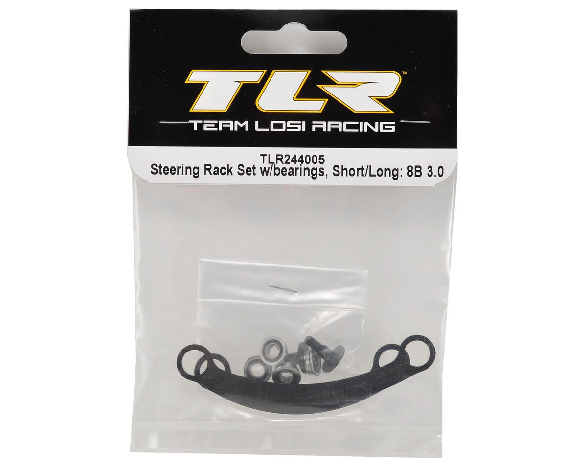 This is a replacement Team Losi Racing Steering Rack Set. Package includes both short and long ackerman plates, as well as replacement ackerman shoulder screws and replacement bearings.